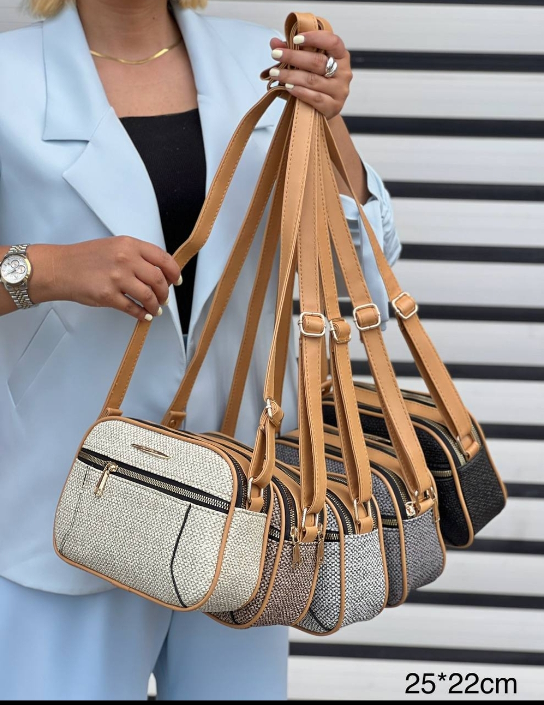 کیف دوشی گردنی با بند بلند دوشی طوسی و کرم
